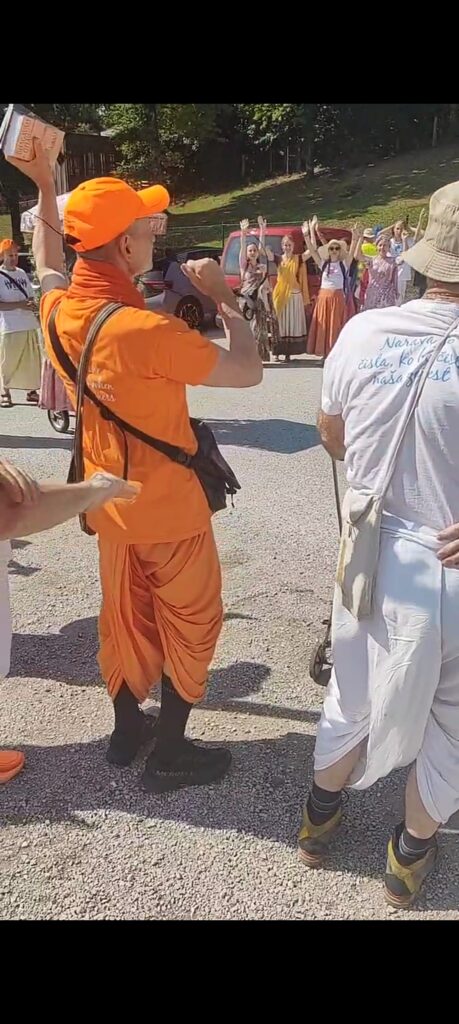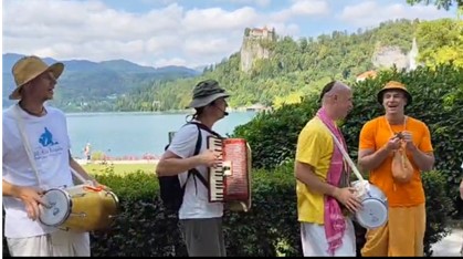 Tokrat smo se po zajtrku odpravili na Bled, kjer nas je pred odhodom po mestu z uvodnim nagovorom navdihnil Lomančita Prabhu. Posebej se me je dotaknilo, ko je izpostavil, kako pomembno je, da se med harinamom po najboljših močeh skušamo osredotočiti na sveto ime. Nato je zbrane bhakte pozval, naj z vso osredotočenostjo, ki jo premorejo, izrečejo Hare Krišna maha mantro. Bhakte so to storili dvakrat, trikrat, vedno nekoliko glasneje, nato pa so vsi dvignili roke v zrak in na ves glas klicali Gospoda. Zatem so zaigrale mridange in karatale in harinam se je začel.