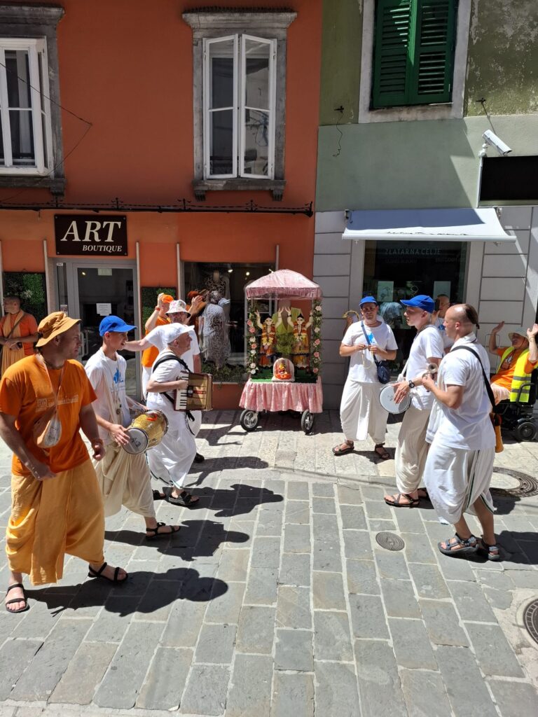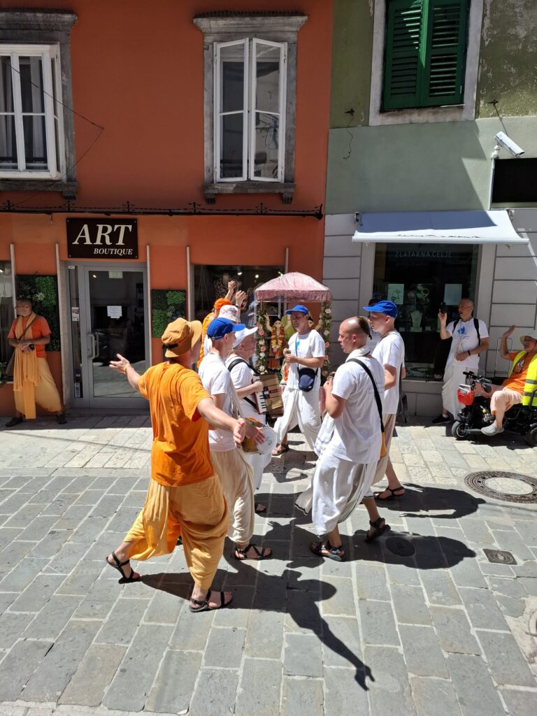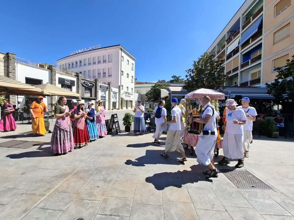 Drugi dan Padayatre 2025 smo se odpravili v Koper, kjer smo takoj po prihodu začeli s harinamom. Po kakšne pol ure smo, ne da bi prekinili petje in igranje na glasbila, naredili skupinsko sliko. Ko sem si jo pozneje ogledoval, mi je v oči padla predvsem raznolikost bhakt udeležencev. Eni v otroških, drugi v odraslih telesih; eni nasmejani, drugi zamišljeni; eni s karatalami, drugi z mridangami, tretji s tamburinom, četrti s harmoniko v rokah…